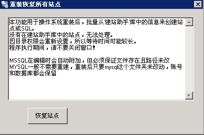 3、點擊提示對話框,會自動打開“網(wǎng)站管理助手”,點擊“系統(tǒng)設(shè)置”--“重裝恢復(fù)”,系統(tǒng)會自動重建用戶賬戶、IIS站點、FTP和mysql。重建成功后會有相應(yīng)提示。