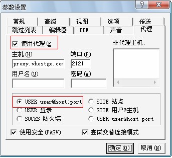 然后點(diǎn)擊“代理”,勾選“使用代理”,主機(jī)地址填寫:proxy2.vhostgo.com,(若這個(gè)地址慢,可以換主機(jī)地址:proxy.vhostgo.com 試試),端口填寫:2121,用戶名和密碼留空,下邊選擇“USER user@host:port”,在使用安全(pasv)前面打上勾, 然后點(diǎn)擊確定即可。如圖: