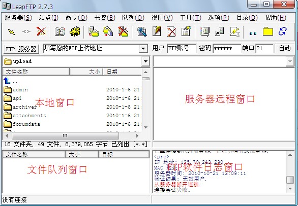 最后回到軟件界面,填寫您的FTP主機(jī)地址、FTP賬號(hào)和密碼連接上傳就可以了,如下圖: