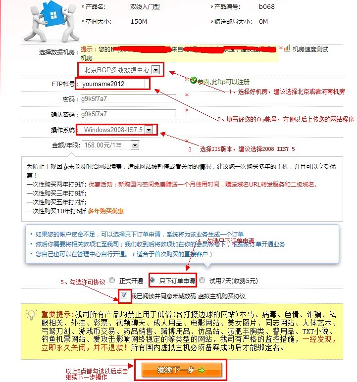 【西部數(shù)碼虛擬主機(jī)】禾城數(shù)碼虛擬主機(jī)購買步驟本文將協(xié)助客戶完成在禾城數(shù)碼完成會(huì)員注冊(并且完成西部數(shù)碼虛擬主機(jī)購買) 為什么說是西部數(shù)碼虛擬主機(jī)呢? 禾城數(shù)碼是西部數(shù)碼伙伴合作伙伴,所以在禾城數(shù)碼能享受更優(yōu)惠的價(jià)格 購買到正規(guī)的西部數(shù)碼虛擬主機(jī)產(chǎn)品,下面我們將講解如何開通虛擬主機(jī)。行這一系列步驟以前,首先要確保你在本站(http://www.jdcfww.com)注冊好了會(huì)員帳號(hào),如果沒有注冊,請先移步到http://www.jdcfww.com/reg/ 進(jìn)行帳號(hào)注冊。注冊過程中如有什么不懂的地方可隨時(shí)聯(lián)系本站在線客服。本文將以開通西部數(shù)碼雙線虛擬主機(jī)為例進(jìn)行講解。為了保證交易能順利進(jìn)行 請先登錄以后再進(jìn)行操作 1、打開禾城數(shù)碼雙線虛擬主機(jī)頁面 http://www.jdcfww.com/services/webhosting/twolinevhost.html 選擇好自己想要注冊的虛擬主機(jī)以后,點(diǎn)擊預(yù)購買產(chǎn)品下面的購買按鈕進(jìn)入下一步【圖】
