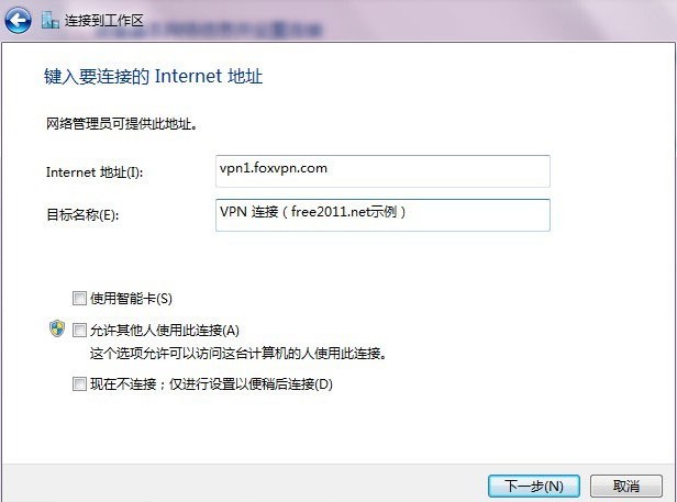 ④ 輸入Internet地址(即VPN服務器地址)和目標名稱(隨意命名)。