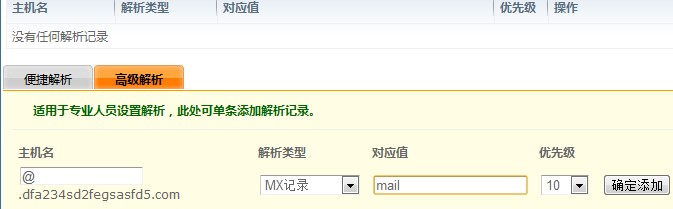 3.cname記錄完成后,再選擇解析類型為MX記錄,在主機名處輸入@,對應值處輸入mail,優先級默認10,如下界面: