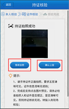 6、點擊圖片可以進行預覽,檢查五官與證件信息是否清晰。如不清晰可以點擊“重新拍照”,確認無誤,可點擊“確認上報”。