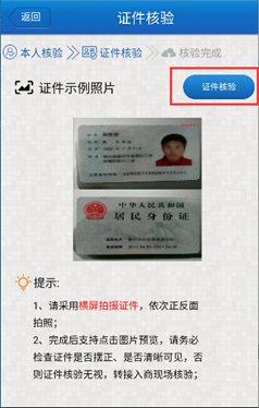 4、手機短信驗證通過后,會進入證件核驗步驟。點擊“證件核驗”按鈕,根據提示先拍攝身份證正面再拍攝身份證反面。身份證拍攝完成后,根據提示檢察拍攝的照片是否符合要求。