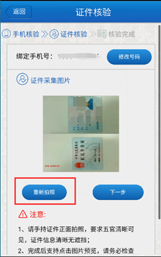 點擊圖片可進行圖片預覽。如不符合,可以點擊“重新拍照”按鈕重新拍攝身份證照片。