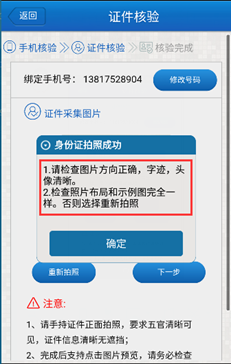 身份證拍攝完成后,根據提示檢察拍攝的照片是否符合要求。